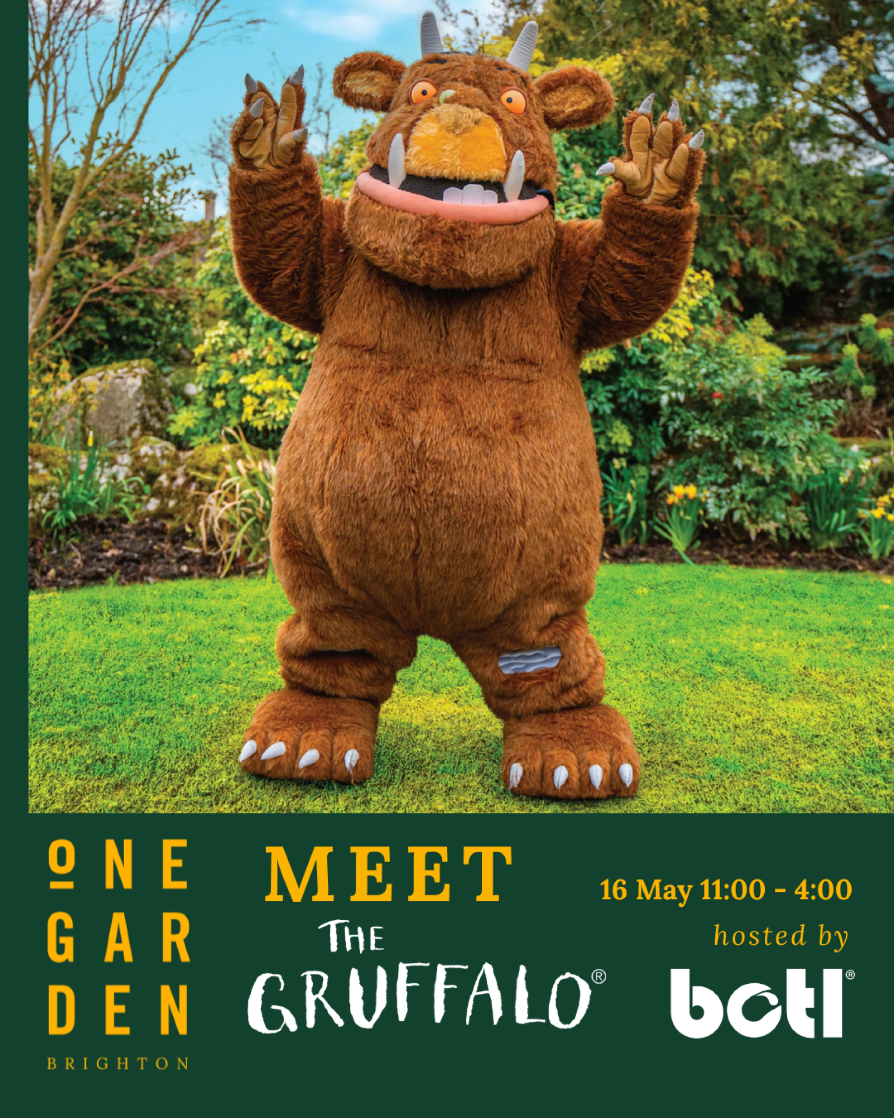 The Gruffalo Comes to One Garden Brighton Step into the magic of the Deep Dark Wood as BOTL brings The Gruffalo to One Garden Brighton for a day of family fun, adventure, and unforgettable moments on May 16th 11:00am -4:00pm.